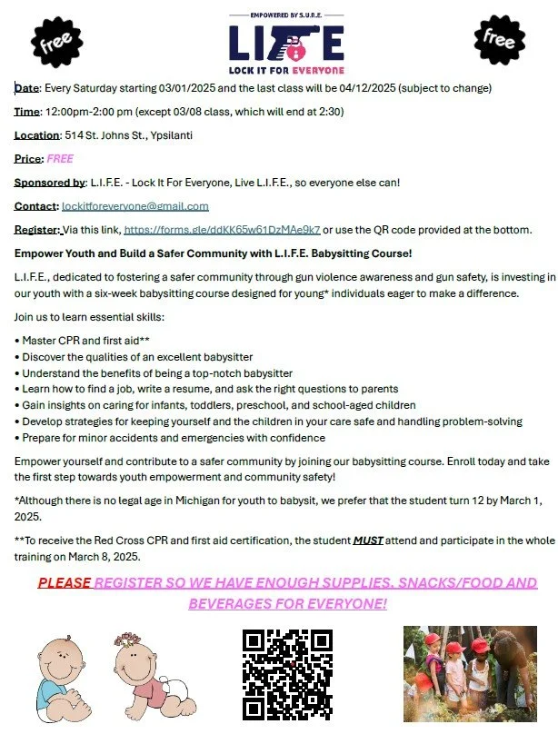 L.I.F.E., dedicated to fostering a safer community through gun violence awareness and gun safety, is investing in our youth with a six-week babysitting course designed for young* individuals eager to make a difference.